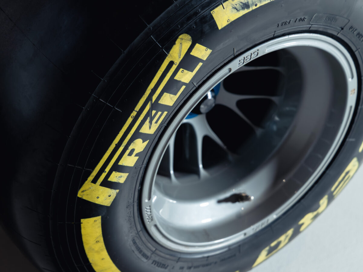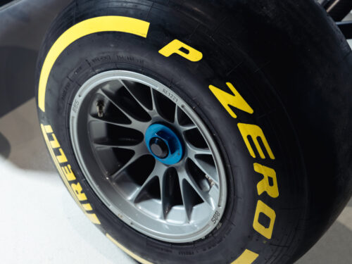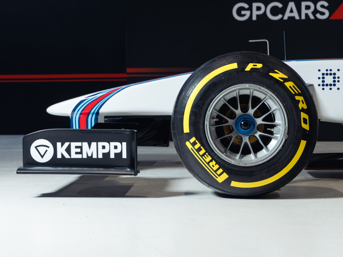 The simulator rolls and steers like a real car and is fitted with genuine Formula One wheels and Pirelli tyres with yellow sidewall markings, giving it authentic presence even when not in use.